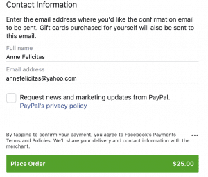 How do I buy a digital gift card on Facebook? | Facebook ... You can find gift cards on Marketplace and in the Shop section of the PayPal USA Page. To buy a digital gift card on Facebook: Go to the PayPal USA Page. Click Shopin the top left. Choose a gift card, select an amount, then click Checkoutin the bottom right. Enter your payment info and click Place order.